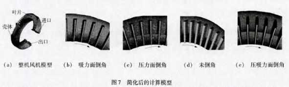 為了更全面的了解高壓鼓風(fēng)機(jī)葉片側(cè)邊型線對(duì)風(fēng)機(jī)性能的影響,考慮到葉片在完全設(shè)有倒角情況下和壓吸兩面都倒角情況下的風(fēng)機(jī)性能。