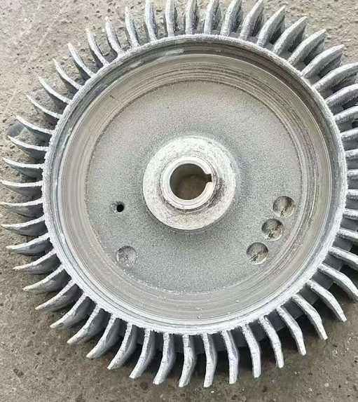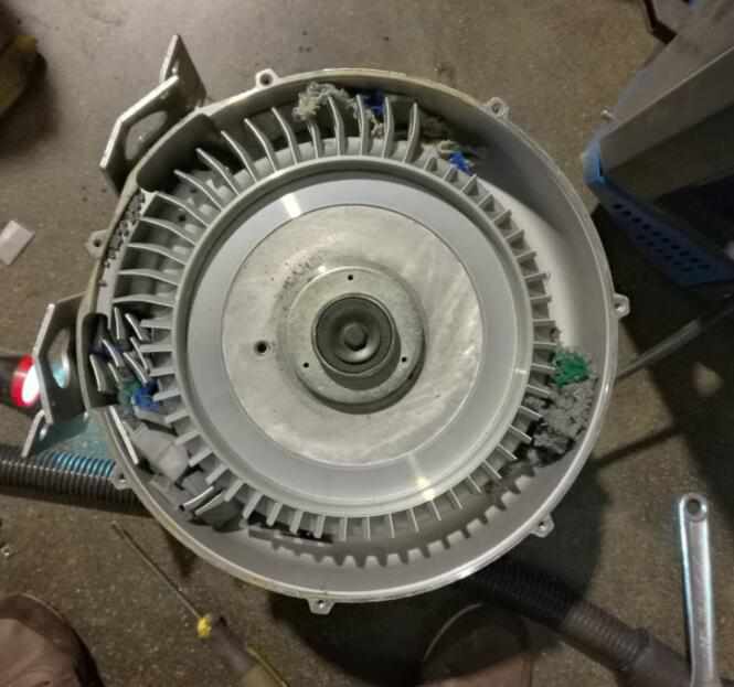 圖為損壞之后的葉輪,因進風口吸進去雜物,導致四周的葉片被堅硬物打碎。所以一要定做好進風口的防護工作。