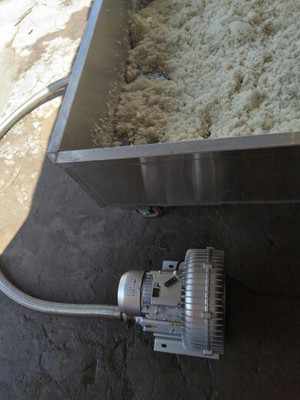 具體方法:此客戶是采用高壓鼓風(fēng)機(jī)的的高壓吹力,通過(guò)管道把風(fēng)量輸送至不銹鋼容器的底部,底部有很多的小氣孔,風(fēng)量通過(guò)氣孔流出,加速容器里面的物流的快速降熱。