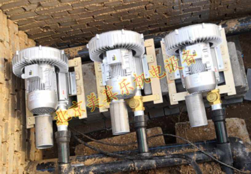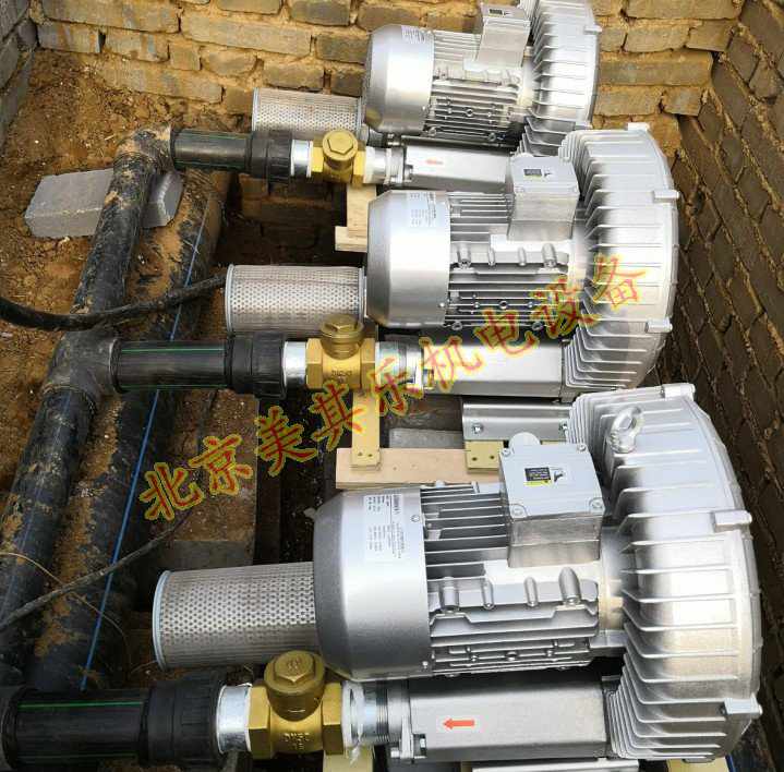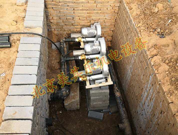 污水處理高壓鼓風(fēng)機(jī)應(yīng)用安裝現(xiàn)場(chǎng)照片,此為延慶客戶(hù)某濕地公園配備的1.6kw鼓風(fēng)機(jī),用于污水的輸送氧氣曝氣,采用兩用一備模式工作,因污水池整體面積不大,而且深度也不是太深。