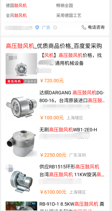 就比方我們搜索鼓風機或者其他什么產品都可以,排在前面的基本上都被廣告占滿了,尤其是手機百度,廣告更是占滿了整個第一頁,廣告就跟之前的鬧得沸沸揚揚的魏則西事件是同樣的一個性質。
